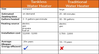 In summary, a tankless water heater can provide you with all of the hot water your family needs on demand, and there’s no fear that you’ll run out at the worst possible moment. If you’re in the market for replacing your water heater, now is a great time to consider going tankless. Take a look at the comparison below: